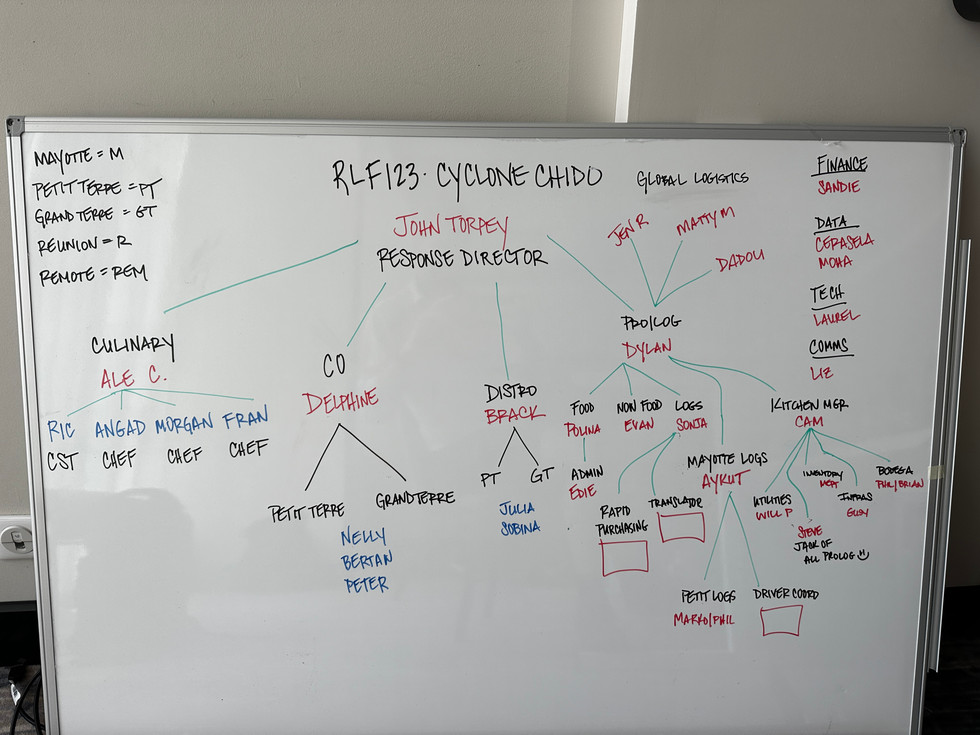 In December I learned of two French territories off Madagascar—Réunion to the east, Mayotte to the west. A cyclone had devastated Mayotte, leaving the community in ruins. The French military sealed the island, closing the airport after air traffic control was destroyed, and took command of the crisis. With no civilian access, we set up remotely on Réunion, working out of a hotel conference room.